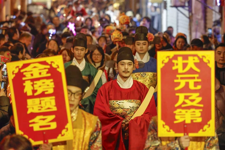 更深层的创新,藏在“非遗年轻化”的底层逻辑里。今年春节,屯溪区非遗体验全面焕新,在老街、河街错落布设非遗体验摊位,在打糍粑的软糯、做糖画的甜香里,注入国潮创意,让老徽州的烟火味道,在年轻指尖焕发新的生机。千灯纳福迎春街会上,民俗踩街的欢腾、花灯巡游的璀璨、孔明灯祈福的浪漫,皆是“古今共生”的生动注脚,也是屯溪对“传承”最生动的诠释:让传统扎根当下,让青春滋养文脉。