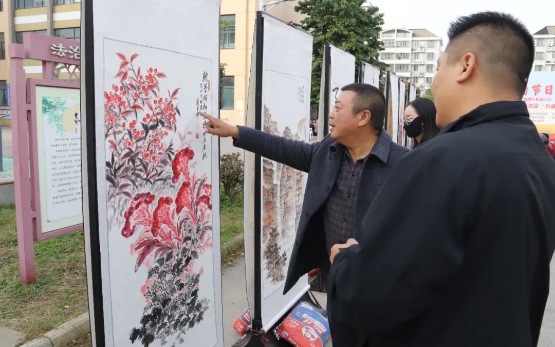 戏台旁的广场上,另一番热闹景象同样引人驻足。重阳节主题书画展前,数十幅书画作品整齐陈列,既有描绘洪泽湖风光的山水画作,也有书写“敬老爱亲”“邻里和睦”的书法作品,笔墨间饱含对传统节日的敬意与对美好生活的向往。“这副《重阳丹华颂秋兴》画得真有神韵,画面色彩与花卉之美相融合,恰好呼应重阳时节的秋意与韵味。”一名社区文艺爱好者仔细端详着画作,不时与身边同伴交流心得。