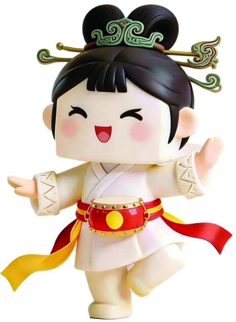 妹妹淮楚楚古灵精怪、活泼可爱,是八公山豆腐传统制作技艺传承人,精通花鼓灯、唱歌和朗诵。她的造型是双丸子头发型搭配楚国凤鸟纹发簪,既保留童真稚趣,又呼应淮南作为楚国故地的历史渊源。服饰方面,身着白色汉服,搭配精致袖口纹饰,辅以红色灵动飘带,更添灵动之美。