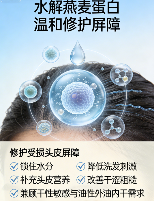 产品添加三大专利养护成分,针对性修护受损头皮屏障,改善头皮敏感泛红、紧绷干燥问题。专利透明质酸钠能够在头皮表面形成透气保湿膜,深层补水锁水,调节头皮水油平衡,缓解头皮干燥,减少出油速度;专利龙胆、黄芩、芍药根复配提取物,协同发挥抗炎舒缓功效,快速消退头皮泛红,降低头皮敏感度,提升头皮耐受力;水解燕麦蛋白温和修护头皮屏障,锁住水分,进一步降低洗护过程中的刺激感,打造健康头皮微环境。