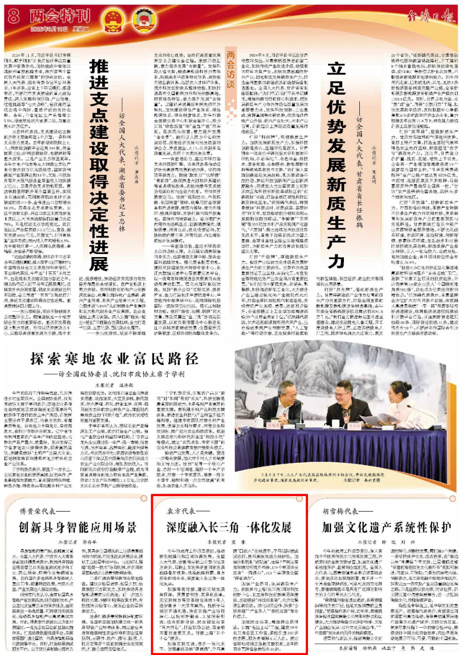 今年的政府工作报告提出,推动新型城镇化和区域协调发展。全国人大代表、安徽省马鞍山市委书记袁方表示,马鞍山市发挥多重国家发展战略叠加优势,找准战略所需、自身所长的结合点,深度融入长三角一体化发展。