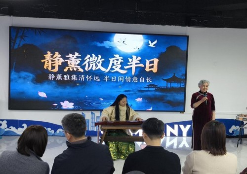 伴随着一幅卷轴缓缓舒展,和平桥街道“逢见美好”半月汇文化沙龙的文化篇章正式铺展,让“茉莉花开·艺通江海”的文化种子,在南大街商圈的沃土上落地扎根、蓄力生长,也让和平桥街道的基层文化建设与民生服务深度相融。卷轴舒展之后,首期“一琴开春·诗词和鸣”非遗雅集精彩上演,在主持人王娅妮的引领下,现场观众沉浸式感受梅庵古琴与诗词朗诵相得益彰的魅力,触摸中华优秀传统文化的温度与力量,让雅韵之美直抵人心。