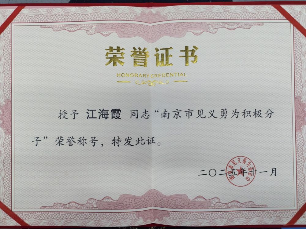 今年4月底,南京市江宁区见义勇为基金会向江海霞颁发了奖励,奖金2000元。今年5月初,南京市见义勇为基金会也向江海霞颁发奖励,奖金5000元。