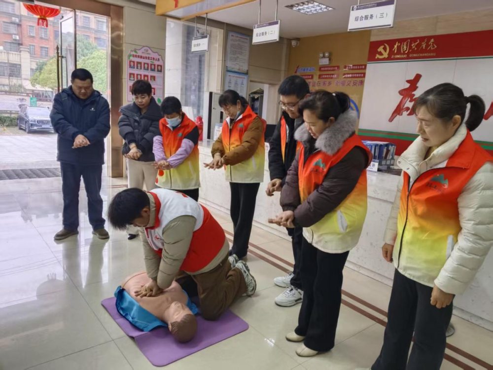 社区服务大厅内,红十字志愿者专业演示心肺复苏操作流程,详解气道异物梗阻急救技巧,内容实用、通俗易懂。党员干部与居民纷纷上前模拟实操,快速掌握实用急救技能,提升应对突发情况的能力。