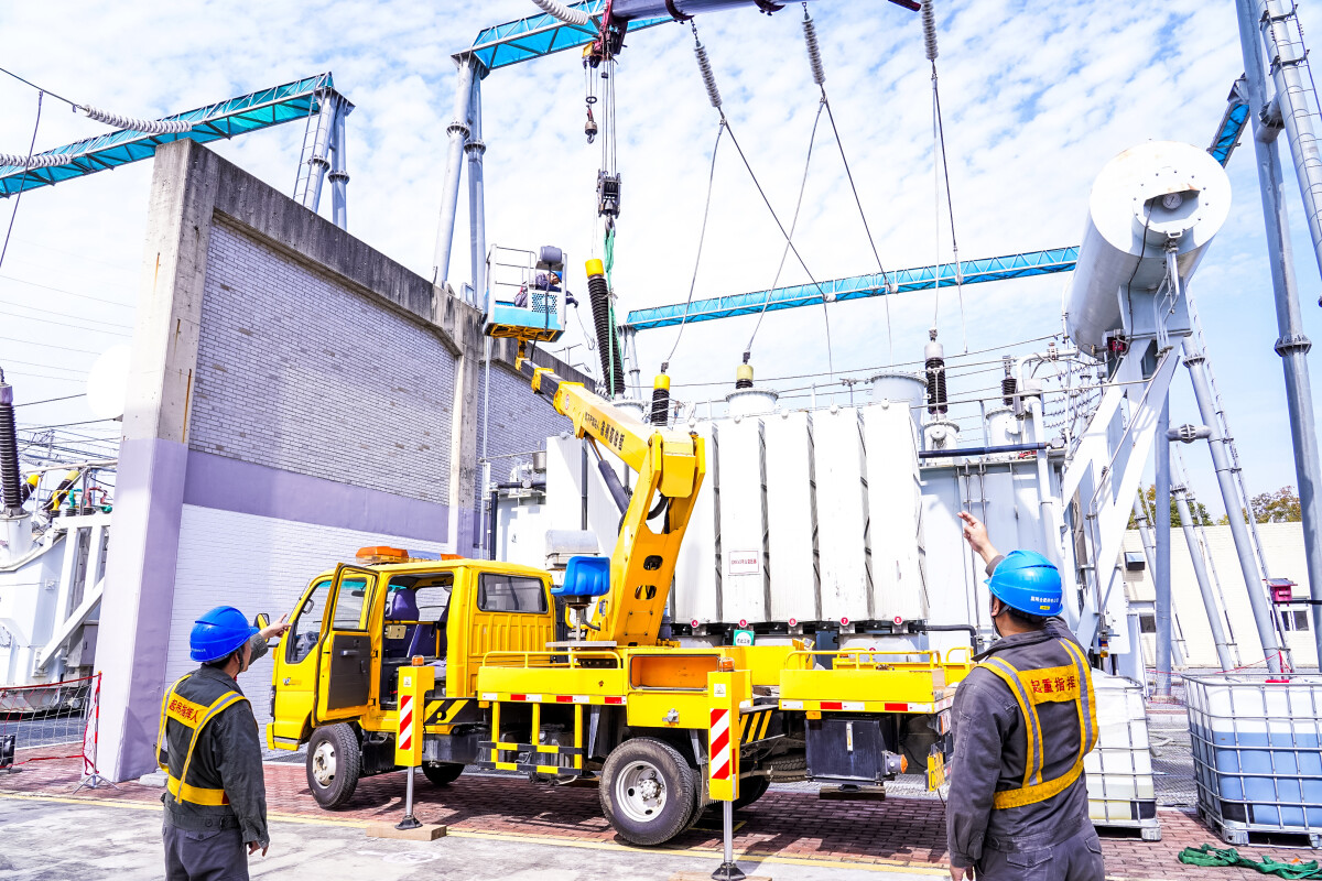 走入滨湖变电站,在2号主变压器处,随着工作负责人发出指令,一台特种作业车辆缓缓展开机械手臂,在轰鸣声中,重达290公斤的主变压器套管稳稳吊升至6米高空。主变压器上,多位检修人员默契配合,将套管精准装配至预定位置,随即立刻执行设备固定和零件安装等工作,整个过程一气呵成。