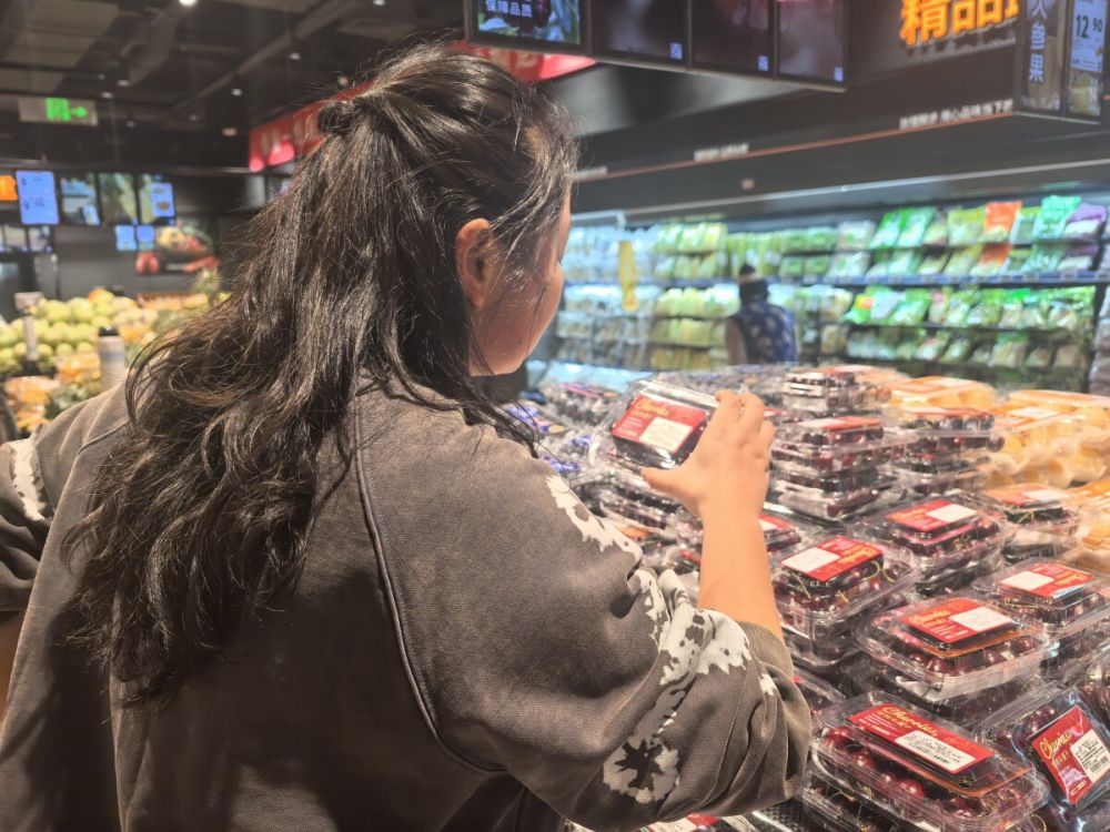 相比精品水果店,超市的车厘子价格相对优惠。在永辉超市,记者看到货架上整齐码放着250克(0.5斤)盒装完好的车厘子,有顾客正在挑选。包装显示为JJ级,每盒售价29.9元(相当于每斤约59.8元)。