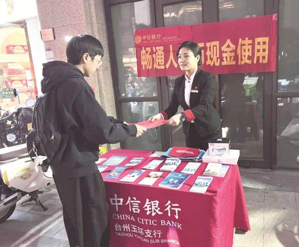 中信银行工作人员向市民讲解现金使用的重要性。