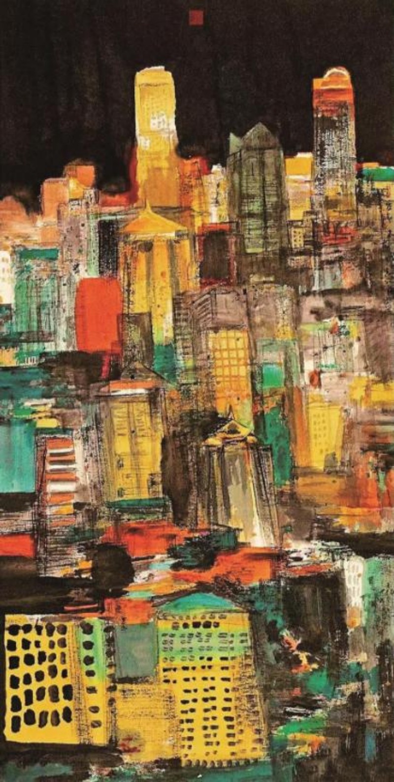再说《金陵不夜城》艺术的创造性,清代画家石涛曾言,“笔墨当随时代。”潘高鹏先生深谙此道。他将中国传统山水画中的深远视角构图并将散点透视与西方的焦点透视空间组合,以写意的笔墨语言深度融合点线面的表现技法,采用明亮的跳跃的黄色为主色调来表现满城的万家灯火,温馨而温暖,再搭配翠绿和橙色作为城市建筑的对比底色,并加以明快的黄色橙色与浓郁的绿色之间的冷暖对比,鲜明而强烈,同时纵情挥洒深褐色的苍茫夜色和对明暗光影的层次处理,深沉而透气,从而形成了对立又统一的整体色调以及深邃有序而气势恢宏的空间语境。所有的一切关系都赋予了《金陵不夜城》绚烂而空灵的视觉冲击与艺术张力。