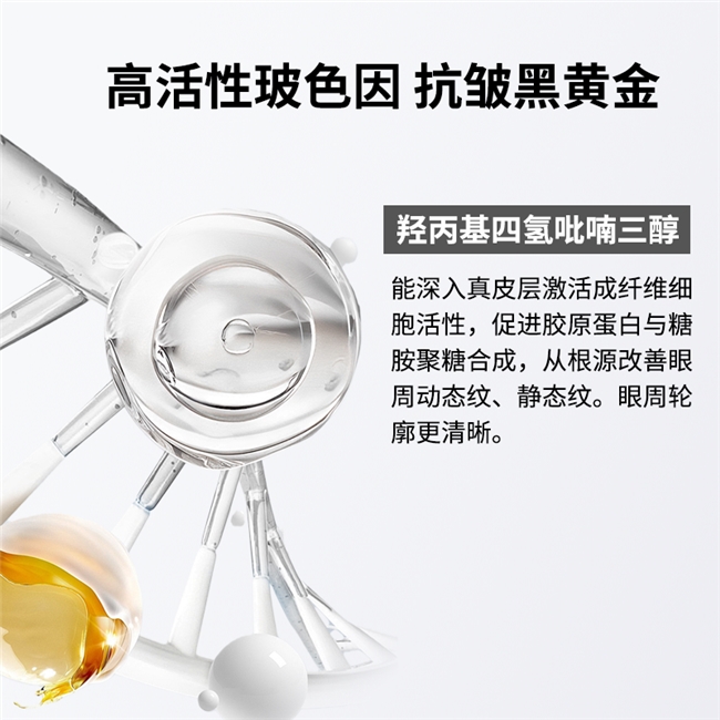 高浓活性配方,专利成分加持:每款添加10%高浓度羟丙基四氢吡喃三醇(玻色因),该浓度达到行业高效抗皱黄金标准,能强效激活成纤维细胞活性,促进糖胺聚糖合成,强化胶原支撑网络,从肌底提升眼周肌肤紧致度与弹性。同时搭配三项中国发明专利成分,形成科学抗衰闭环:烟酰胺(专利号ZL201610522039.9)调节黑色素转运,改善眼周暗沉,修护肌肤屏障;可溶性胶原(专利号ZL201110327865.5)小分子形态直接补充肌底胶原,填补细纹空隙;羟丙基四氢吡喃三醇(专利号ZL202111296847.5)精准强化胶原新生,延缓松弛下垂。