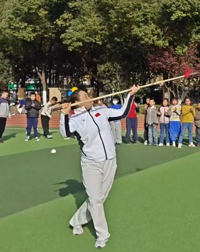 “哇,老师再来一遍!”当徐娜娜举枪站定,这句喊声已经从队伍里窜出来。她一出手,枪尖在阳光下划出一个利落的弧度,动作刚落地,围观的孩子就跟着“抖”了一下,忍不住感叹“太帅了”。