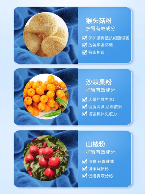 包含鼠李糖乳酪杆菌LRa09、嗜酸乳杆菌LA05(中国发明专利)、短双歧杆菌BBr96(中国发明专利)、干酪乳酪杆菌LC89、长双歧杆菌长亚种BL11(中国发明专利)、植物乳杆菌N13与Lp18等全明星阵容。每种菌株均经验证有效调节肠道有害菌群,从根源改善口臭,并高效作用于排便(促进健康香蕉状排便、改善便秘腹泻、净化排便异味)。进入肠道后1小时活性超96%,联合益生元实现精准分群管理,持久改善肠胃状态。猴头菇粉可修复胃黏膜,预防幽门螺杆菌侵袭;沙棘果粉富含维生素C,增强免疫力;山楂促进胃液分泌、健脾消食,形成全方位调理矩阵。