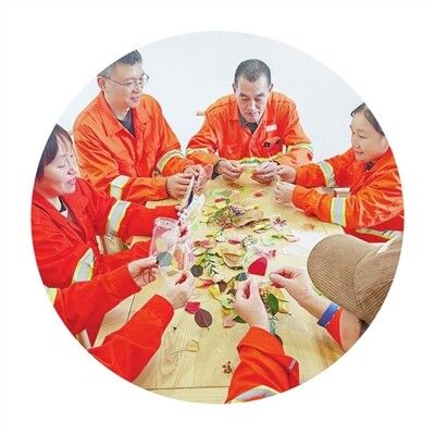 在河道巡查人员的指导下,大家开始动手制作。习惯了用力的双手,此刻变得格外轻柔。工友们一边认真挑选心仪的叶片,一边分享着工作中的趣事。他们小心翼翼地摆弄着脆弱的叶片,覆上透明的书签膜,再搭配上多彩的流苏。