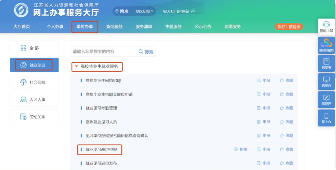 2. 选择[单位办事]—[就业创业]—[高校毕业生就业服务]—[就业见习基地申报]