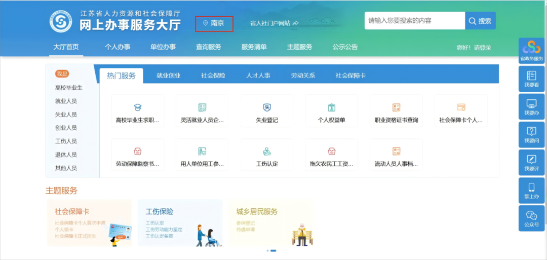 1. 打开江苏省人力资源和社会保障厅网上办事服务大厅https://rs.jshrss.jiangsu.gov.cn/index/,登录单位账号,地区请选择[南京];