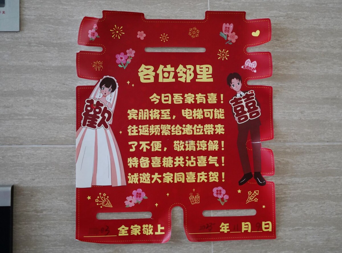 11月10日上午,记者闻讯而至,在这栋居民楼的电梯口,一张红底黄字的“告示”依然静静贴在墙上,诉说着一段温馨的邻里故事——它出自一位办喜事的业主之手。字句真挚朴实,既为婚礼期间宾客往来可能带来的打扰表达歉意,也向邻里发出“共沾喜气”的真诚邀约。