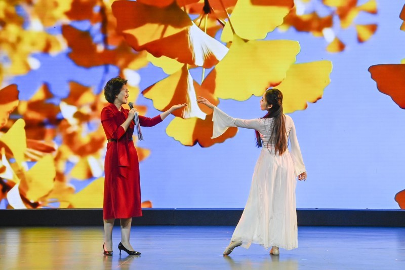 著名表演艺术家丁建华这是第二次参加义海的诗歌朗诵会。2015年她曾参加义海创作三十年诗歌朗诵会。丁建华这次朗诵了义海的作品《金鱼的墓碑》,并与义海合作朗诵了《西茉纳之歌·流浪》。丁建华在朗诵艺术上精益求精的艺术精神,深深感染了在场的每一位听众。朗诵结束后,丁建华说:“朗诵,是让文字获得第二次生命的过程。今天,当我再一次站在盐城的舞台上,用声音走进义海老师的诗歌世界,依然能感受到那份纯粹的艺术震颤。从《西茉纳之歌·流浪》的流动与诗意,到《金色的墓碑》的庄重与深刻,每个字都承载着情感的力度,美学上的纯粹。声音的艺术,是分寸,是理解,更是对创作者最深的致敬。感谢诗歌,感谢这片土地,让我们在同一个时空,共同抵达远方。”