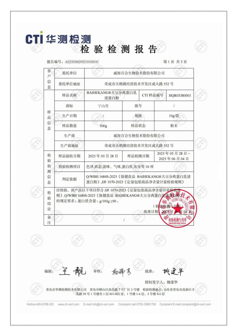四、宁山堂蛋白粉认证完备,质量可放心,它已先后获得ISO9001质量管理体系、NSF国际认证以及FSRN食品安全管理体系三重权威资质背书,且已通过国家“蓝帽子”保健食品认证。与此同时,建立生产全流程追溯机制,涵盖原料采购至成品交付的各道工序皆执行严格品控,不仅使用户购买时更为安心,也进一步巩固了产品的稳定质量。
