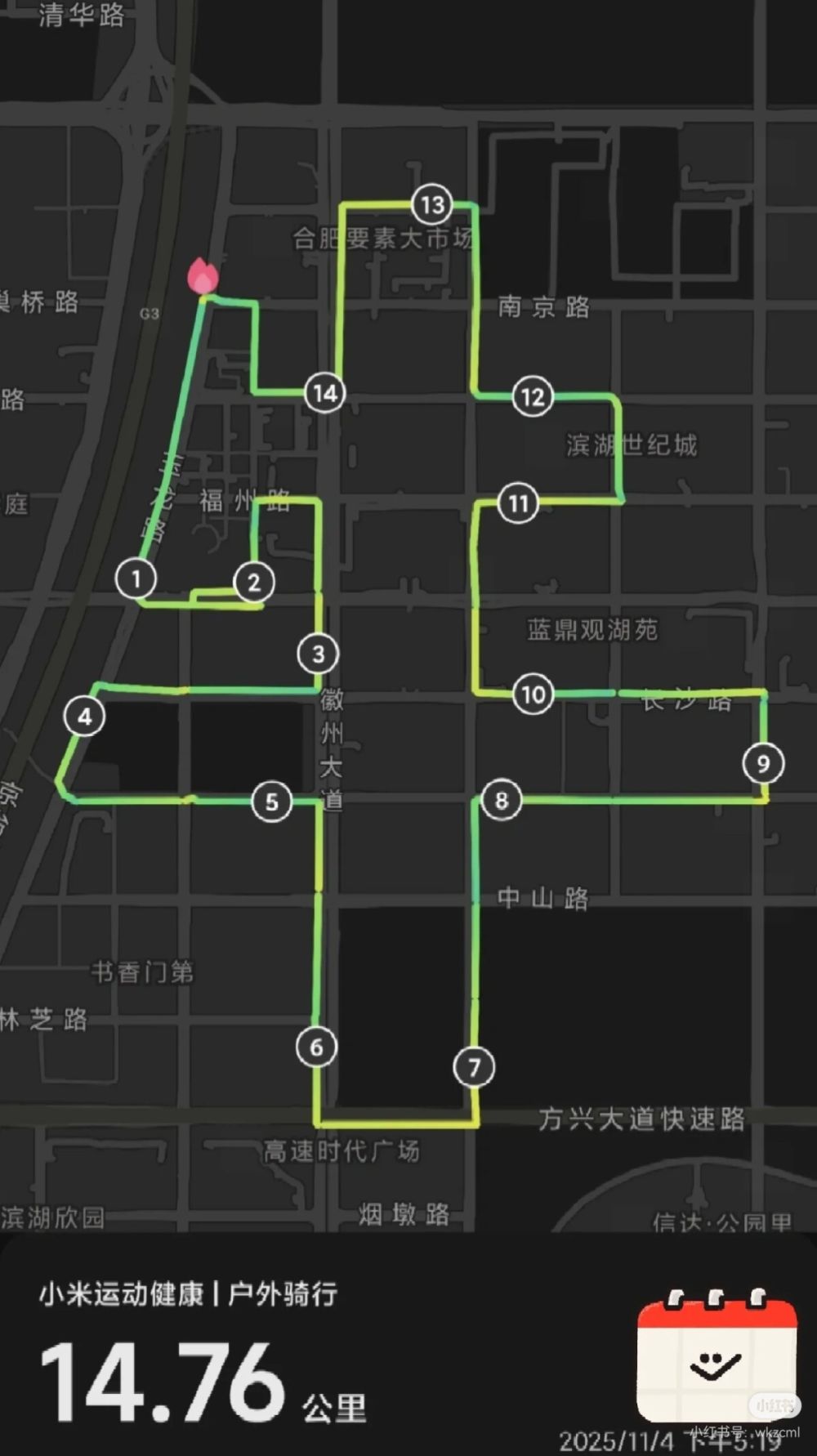 拥有两年多运动经历的王同学,对滨湖的骑行环境赞不绝口。“滨湖给我的第一感觉就是——特别适合骑行和跑步。”他详细阐述道,“这里道路宽、视野开阔、人也不算多,环境舒服、节奏也不急躁,骑车或跑步时都很放松,称得上是整个合肥最友好的运动区域之一。”他表示,这种优质的城市运动空间,为轨迹创作提供了先天条件,规整的路网、较少的车流量,让“画字”式骑行从创意落地为现实。