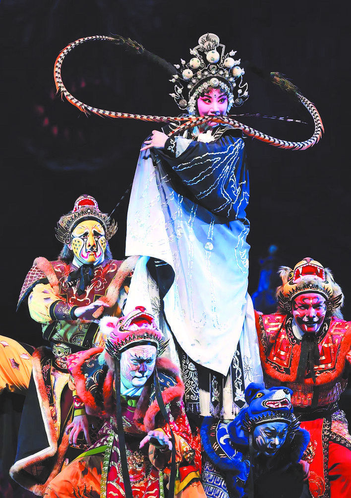 更令人称奇的是,剧中融合了川剧变脸技巧与婺剧自身的快速换装,使得白骨精在数秒内完成了面具、服装、妆容的“三连变”。而白骨精被孙悟空棒杀后的“三连遁”,第一次是通过烟雾、灯光与“替身”机关,让“假尸”与“真身”分离,通过吊威亚制造元神出窍的幻觉,得以逃走;第二次则是利用极快的“黑场”,扮演老妪的演员通过翻跌技巧离开表演区;第三次则是将“老翁”赶至后台口,一棒杀下,老翁翻转下场,只留一嘬尾烟。这种变幻莫测的舞台呈现,不仅强化了戏剧冲突,更是增强了演出的观赏性和“闹热”感。