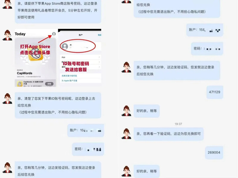 不法分子在二手平台发布低价售卖各类购物卡的虚假信息,吸引想节约成本的消费者。等消费者上钩后,就以验证身份信息为由,要求其提供手机ID和密码,获取后通过手机商店虚假消费骗取钱财。