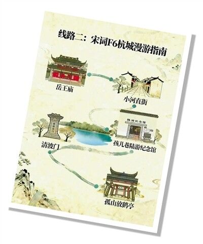 其中《宋词F6杭城漫游指南》,聚焦岳飞、辛弃疾、姜夔、陆游、李清照、苏轼六位宋词“顶流”,构筑了一张“宋词天团打卡地图”。它从岳王庙出发,途经小河直街、陆游纪念馆、清波门,最终抵达孤山放鹤亭。