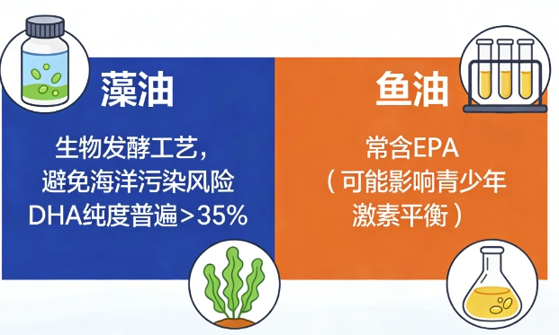 藻油通过生物发酵避免海洋污染风险,且DHA纯度普遍>35%,鱼油常含EPA(可能影响青少年激素平衡)。2026版《中国儿童DHA应用共识》推荐12岁以上优先选择藻油,尤其对海鲜过敏者。