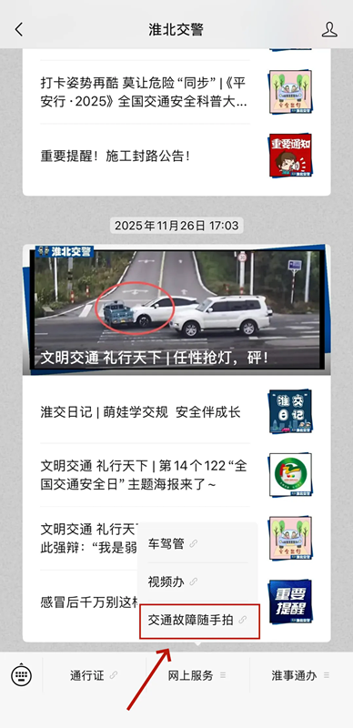 为进一步做好道路交通安全管理工作,广泛收集社情民意,淮北市公安局推出“淮北交通故障随手拍”功能,每一个交通参与者都可以是道路交通安全设施的巡查员。具体操作如下:
