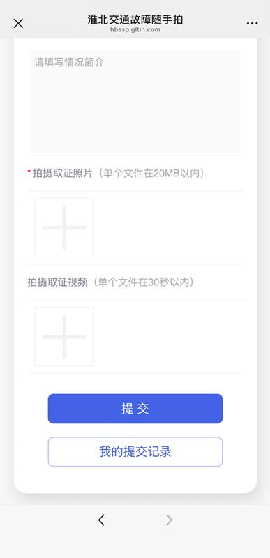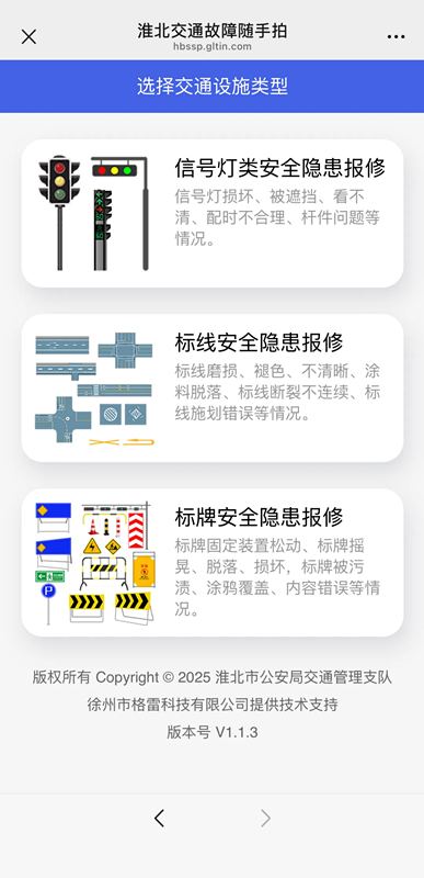 大家出行时如果发现道路交通信号标志、标线等交通安全设施损坏、遮挡或设置不合理时,可以通过“淮北交通故障随手拍”功能进行反映。