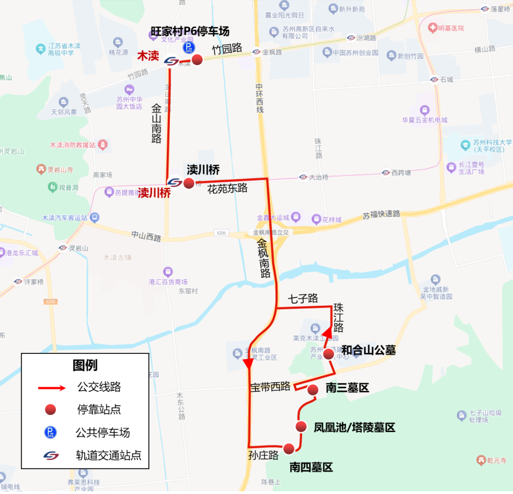 旺家村P6停车场(1号线“木渎”站),渎川桥(5号线“渎川桥”站),南四墓区,凤凰池/塔陵墓区,南三墓区,和合山公墓