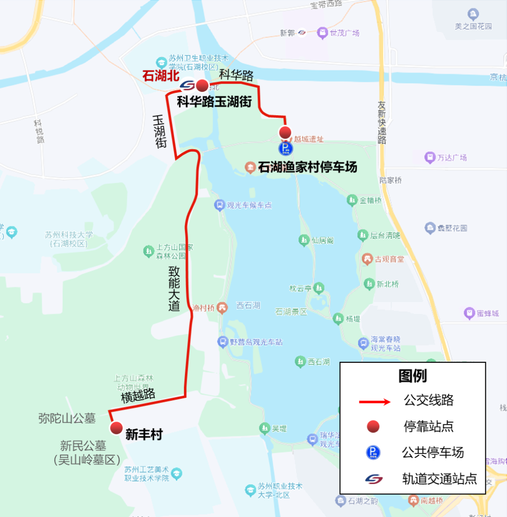 “石湖渔家村”停车场,科华路玉湖街(3号线“石湖北”站),国际教育园北区首末站(上方山公墓、福寿山公墓)