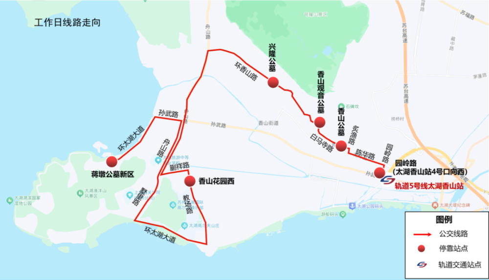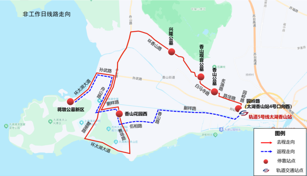 地铁5号线“太湖香山”站1号口→591路、地铁5号线“太湖香山”站4号口→692路至“香山花园西”站