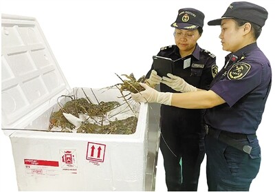 近日,一架来自越南的客机降落在杭州萧山国际机场,除了入境旅客之外,飞机腹舱内还带来了来自越南的800公斤波纹龙虾。