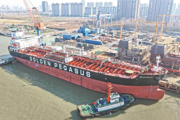9日下午2点多,长江江阴段中船澄西码头一派繁忙景象。随着汽笛长鸣,马绍尔群岛籍“CS FUJAIRAH”轮缓缓驶离码头,向着远海进发。这是江阴口岸今年交付出口的首艘新造船,江阴造船产业迎来出口“开门红”。