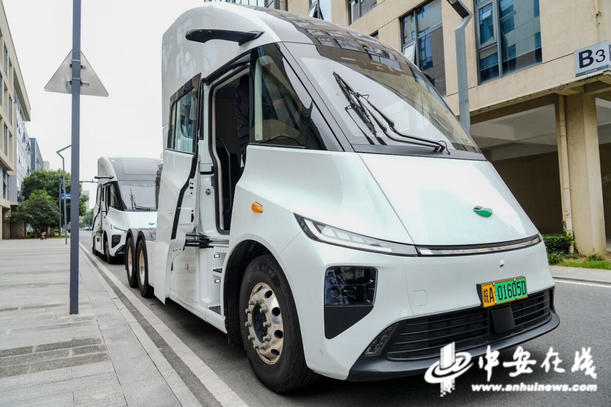 白色流线型车身,颇具未来感;居中驾驶位,4.5m²前风挡玻璃面积,视野更开阔;独立双屏,运行路况信息尽在眼前……在合肥包河区中关村协同创新智汇园,由苇渡科技自研的新能源智能重卡——苇渡R700让前来参观的记者们眼前一亮。据苇渡科技企业发展负责人奚星捷介绍,R700不仅实现道路运输零排放与智能化,还大大降低了运输企业的成本。“这台车满载49吨,在80码的车速下,每公里仅耗1度电。”
