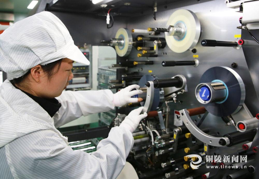 11月19日,狮子山高新区安徽申格电子卷绕车间内,工作人员在检验电容器芯子性能。