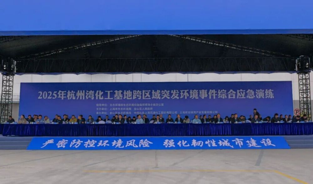11月12日下午,由市生态环境局、金山区人民政府联合主办的“2025年杭州湾化工基地跨区域突发环境事件综合应急演练”在上海石化园区成功举行。市生态环境局党组书记唐家富出席活动并讲话,副局长汤臣栋担任演练现场总指挥,生态环境部应急办应急六处处长王华现场指导并进行点评,上海石化党委书记、董事长郭晓军,总经理鹿志勇,副总经理周国明,金山区副区长罗明陨出席。