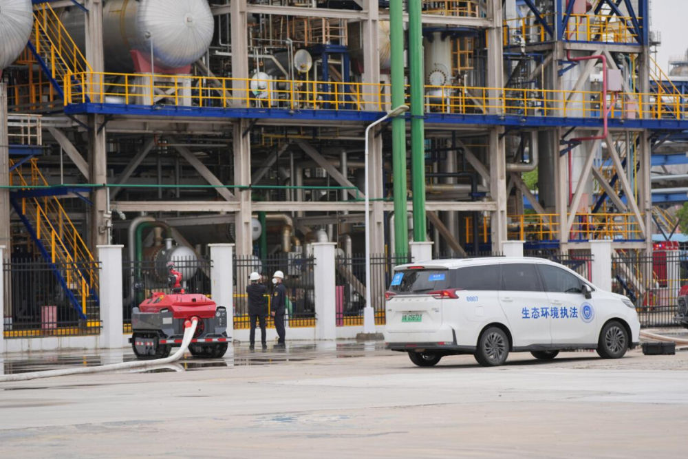 杭州湾化工基地是长三角核心区规模最大的石化产业集群,毗邻杭州湾海域及沪浙省界界河,具有风险源多、分布范围广、产业链条长的复杂特征。本次演练围绕跨区域环境污染极端情景痛点难点问题,模拟两起突发环境事件先后发生:一是上海石化园区烷基化装置法兰泄漏后发生爆燃造成次生水污染事件,二是因氮气管道失压连锁引发碳谷绿湾产业园企业槽罐车环氧乙烷泄漏事件。演练凸显三大亮点:一是指挥体系“一体化”。围绕市、区、园区三级环境应急指挥中枢联动,依托“空天地水”一体化监测网络,充分运用无人机群、机器狗、移动应急指挥车、污染扩散模型等现代化装备和手段,实现风险信息实时共享、指挥指令闭环流转,验证了各级应急预案的科学性与可操作性。二是演练场景“实战化”。以真实火灾事故为原型,叠加环氧乙烷罐车泄漏事故,全流程模拟装置爆燃、物料泄漏、灭火救援、环境监测、人员疏散等场景,过程节奏紧凑、实战氛围浓厚,通过实况直播,让参演人员身临其境感受突发事件处置的紧迫性与复杂性。三是区域命运“共同体”。纵向层面,生态环境部与市、区两级政府及生态环境、应急、消防等10余个部门快速响应、高效协作,集中优势资源形成处置合力;横向层面,上海与浙江生态环境部门同步现场排查、开展监测、实时共享信息,为实现污染不跨省转移应急目标提供支撑,构建起长三角区域环境应急“命运共同体”。