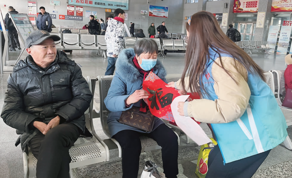 在志愿服务岗台上,除了出行指南、应急物品等便民物资,还有大家精心准备的福字、春联等新春礼品。志愿者们将一份份祝福送到旅客手中,红纸映着笑脸,浓浓年味在车站里悄然弥漫。