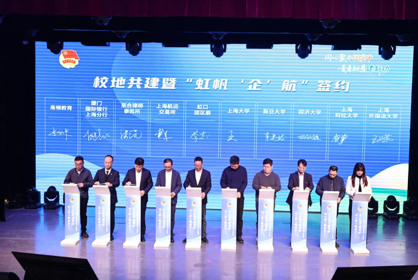 在校地共建暨“虹帆‘企’航”签约启动仪式上,团区委与复旦大学团委、同济大学团委、上海财经大学团委、上海外国语大学团委、上海大学团委,以及上海航运交易所、厦门国际银行上海分行、上海高顿教育科技有限公司、上海至合律师事务所进行签约,进一步推动校企地在思政教育、就业创业、社区治理、社会实践、志愿服务等方面深化合作。新一批百个高校学生企业实习岗位正式发布。