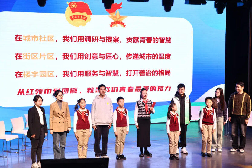 善治共治,青年参与。情景演绎《共筑青春善治成长链》以第四中心小学少先队社会化实践探索为线,通过对话华师大一附中、华东理工大学、曲阳路街道、北外滩街道的青年代表们,展示了党建引领青年参与基层治理、网格化片区、楼宇治理的工作成果与感悟。