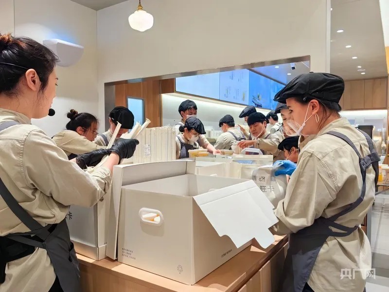 奶茶每日单量最高能破万杯,桃酥每日销售逾10万片,面对“汹涌”的订单,商家也铆足劲儿做好服务:奶茶、桃酥店调派200多名人手轮番“上阵”,还为游客送上暖宝宝、明信片、棒棒糖、小饼干,引导员随时陪等待的顾客聊聊天……