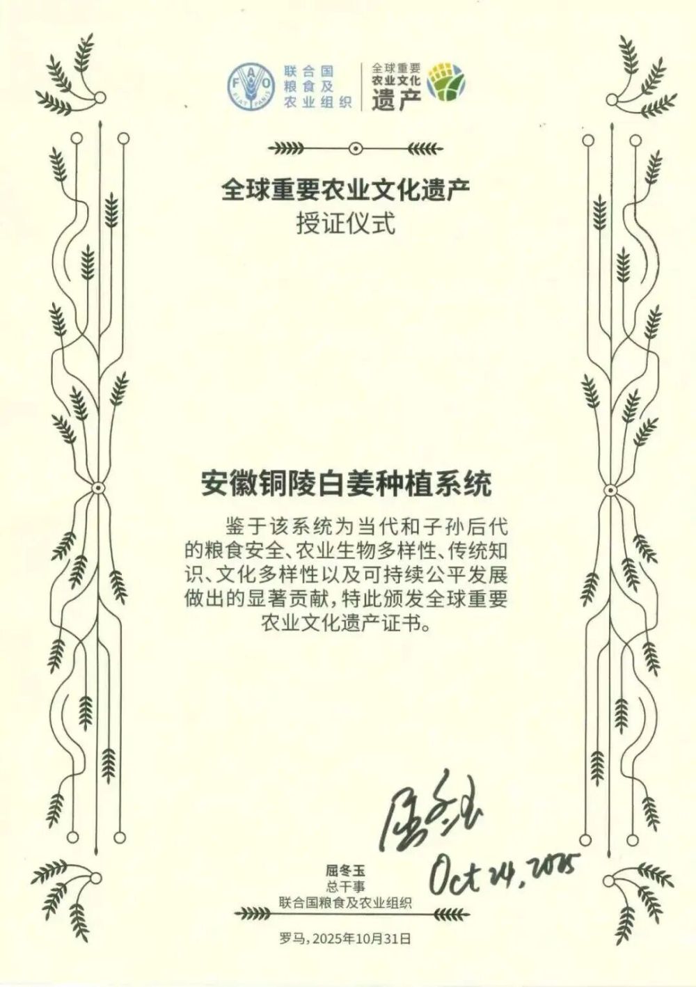 2025年10月,铜陵白姜种植系统成功获得联合国粮农组织授予的“全球重要农业文化遗产证书”。作为铜陵白姜的核心产区,义安区建成了铜陵白姜种质资源保护与繁育实验室,培育白姜抗病新品系,为“铜陵白姜”提供种源安全“压舱石”。