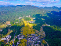 金秋时节,黟县宏村镇塔川国家森林公园内,金黄稻田与粉墙黛瓦的村落相映,绘就一幅丰收与古韵交织的秋日画卷。