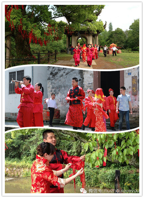 一个阳光明媚的初夏,一场传统温馨的徽式婚礼,古道石板路映衬着红艳的迎亲队,喇叭唢呐路引两侧,红纱装饰的盖头,营造出神秘浪漫的气息,在被誉为“天下第一鹊桥树”的槐荫树下,当乐章响起,在所有来宾的祝福下,新人一起走过幸福之路,许下了彼此相守一生的诺言。