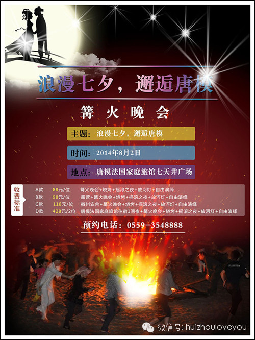 徽州农舍+篝火晚会+烧烤+摇滚之夜+放河灯+自由演绎,118元一位哦。不过住徽州农舍是啥滋味呢,小编我也没感受过,你们尽情想象下啦。一定很感兴趣吧。